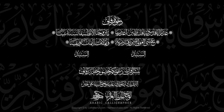 In this beautiful and unique Arabic calligraphy, the name “Mariam Abdul Aziz Al Saied – مريم عبد العزيز السعيد” is elegantly presented in the classic Thuluth script. The calligraphy showcases the name in a beautiful and sophisticated manner, emphasizing the timeless elegance of the classical Thuluth script. Each stroke is meticulously crafted, contributing to the overall aesthetic appeal of the name in this traditional script.